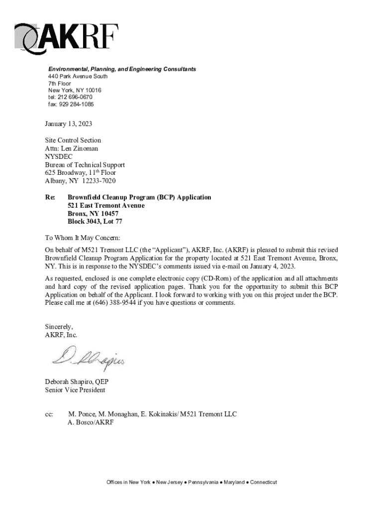 Environmental, Planning, and Engineering Consultants 440 Park Avenue South 7th Floor New York, NY 10016 tel: 212 6960670 fax: 929 2841085January 13, 2023 Site Control Section Attn: Len Zinoman NYSDEC Bureau of Technical Support 625 Broadway, 11th Floor Albany, NY 122337020 Re:Brownfield Cleanup Program (BCP) Application 521 East Tremont Avenue Bronx, NY 10457 Block 3043, Lot 77To Whom It May Concern: On behalf of M521 Tremont LLC (the Applicant), AKRF, Inc. (AKRF) is pleased to submit