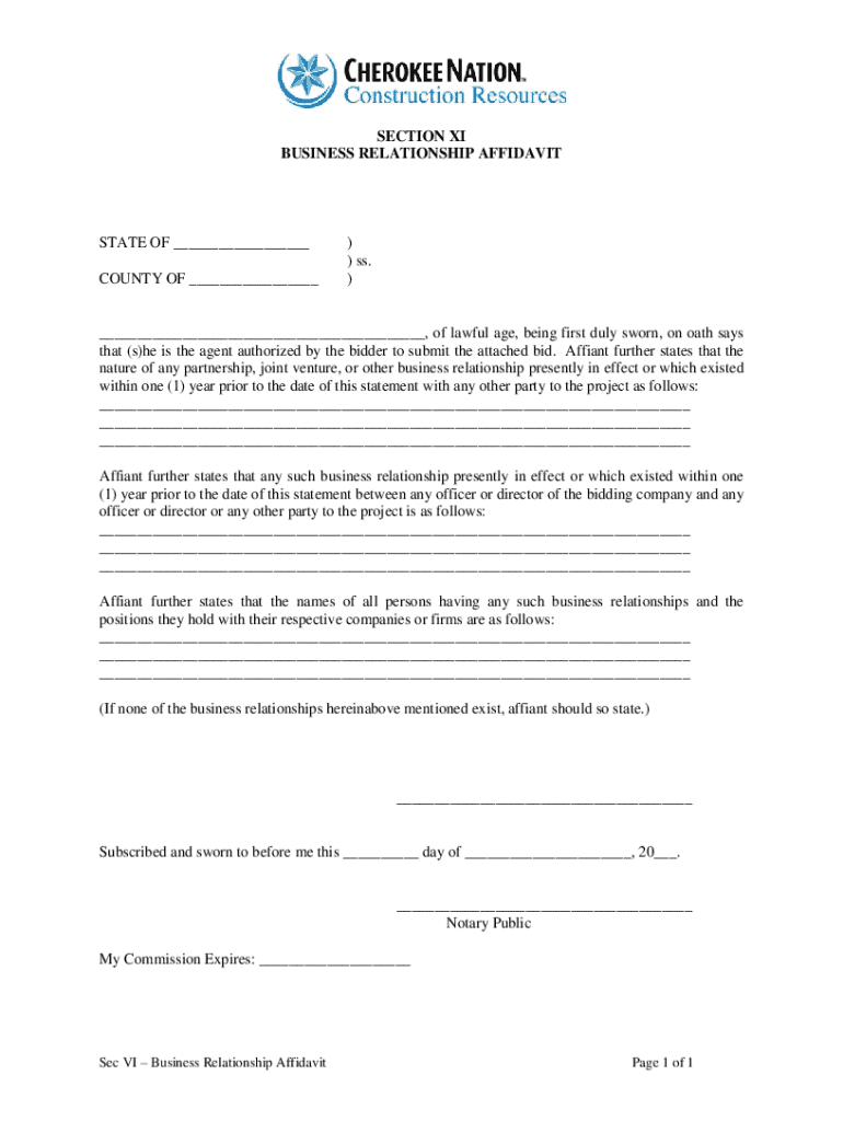 Cherokee Nation Business Relationship Affidavit Form Versions