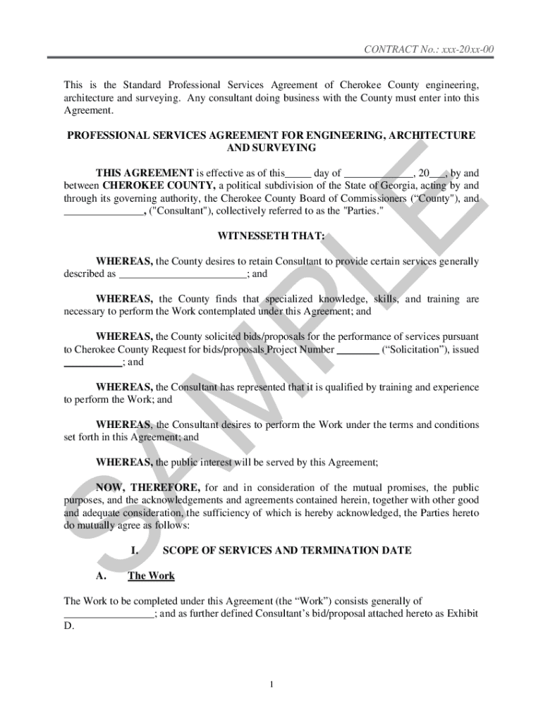 CONTRACT No.: xxx20xx00 This is the Standard Professional Services Agreement of Cherokee County engineering, architecture and surveying. Any consultant doing business with the County must enter into