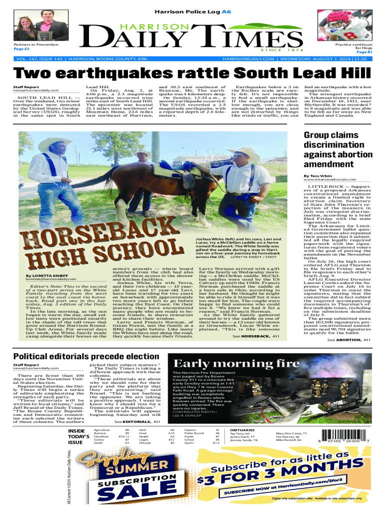 for HogsPartners in Prevention Page A3Page B1VOL. 147, ISSUE 145 | HARRISON, BOONE COUNTY, ARK.HARRISONDAILY.COM | Wednesday, August 7, 2024 | $1.50Two earthquakes