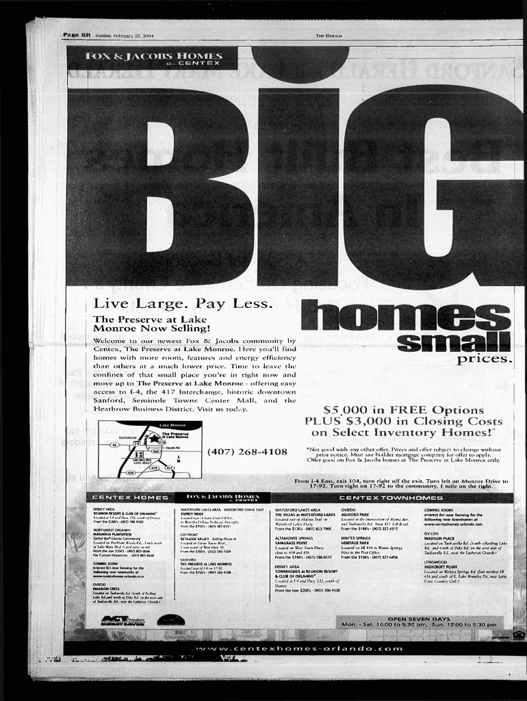 Page OBTin? II cramiSunday. February 22.2004F O X & JA C O B S H O M E S ov. C E N T E XLive L arg e. Pay Less. The Preserve at Lake Monroe Now Selling! Welcome to our newest Fox &: Jacobs community by Centex, The Preserve at Lake Monroe. Here youll finds ma l lp rice s.homes with more room, features and energy efficiency than others at a much lower price. Time to leave the confines of that small place youre in right now and move up to The Preserve at Lake Monroe offering