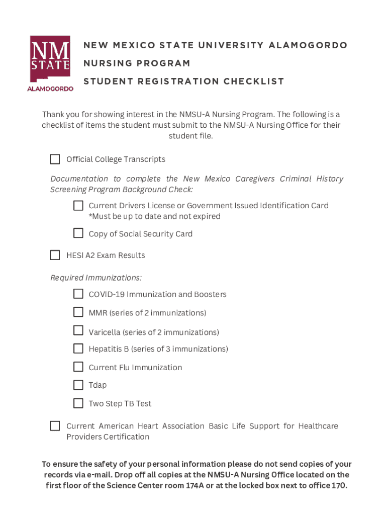 NEW MEXICO STATE UNIVERSITY ALAMOGORDO NURSING PROGRAM STUDENT REGISTRATION CHECKLIST Thank you for showing interest in the NM SUA Nursing Program. The following is a checklist of items the student