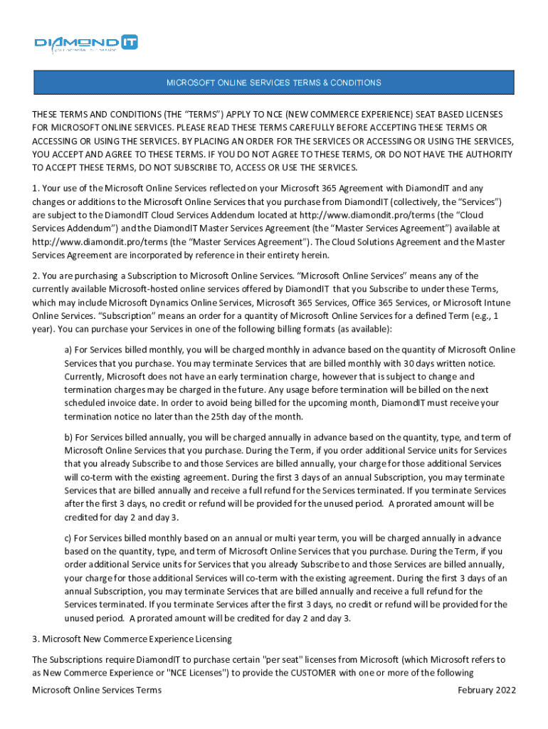 MICROSOFT ONLINE SERVICES TERMS & CONDITIONSTHESE TERMS AND CONDITIONS (THE TERMS) APPLY TO NCE (NEW COMMERCE EXPERIENCE) SEAT BASED LICENSES FOR MICROSOFT ONLINE SERVICES. PLEASE READ THESE TERMS