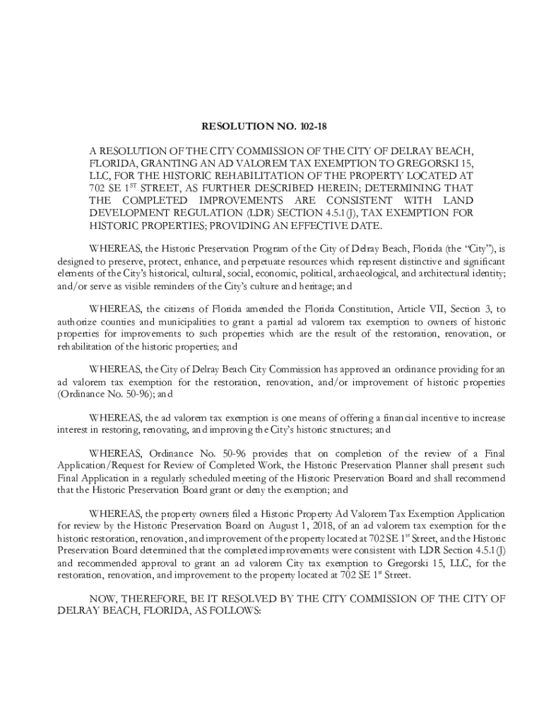 This document grants an ad valor em tax exemption for Gregory 15, LLC, for the historic rehabilitation of property at 702 SE 1st Street, enhancing Delray Beach\'s historical preservation efforts.