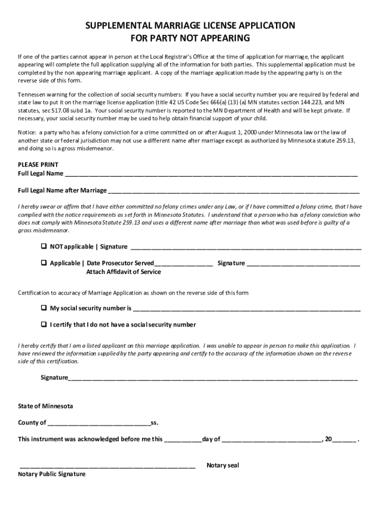 Complete this supplemental marriage license application for parties unable to appear in person. Comply with legal requirements and ensure accurate information for marriage licensing.