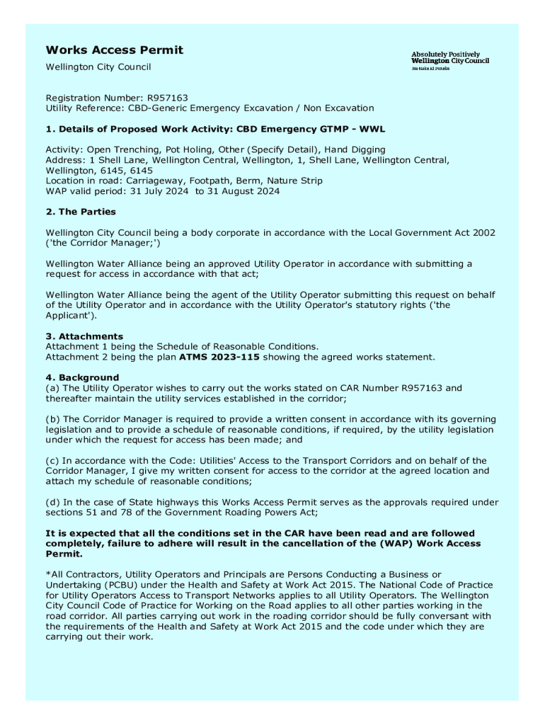Works Access Permit Wellington City Council Registration Number: R957163 Utility Reference: CBDGeneric Emergency Excavation / Non Excavation 1. Details of Proposed Work Activity: CBD Emergency GTMP WWL Activity: Open Trenching, Pot Holing, Other (Specify Detail), Hand Digging Address: 1 Shell Lane, Wellington Central, Wellington, 1, Shell Lane, Wellington Central, Wellington, 6145, 6145 Location in road: Carriageway, Footpath, Berm, Nature Strip WAP valid period: 31 July 2024 to 31 August 2024 2