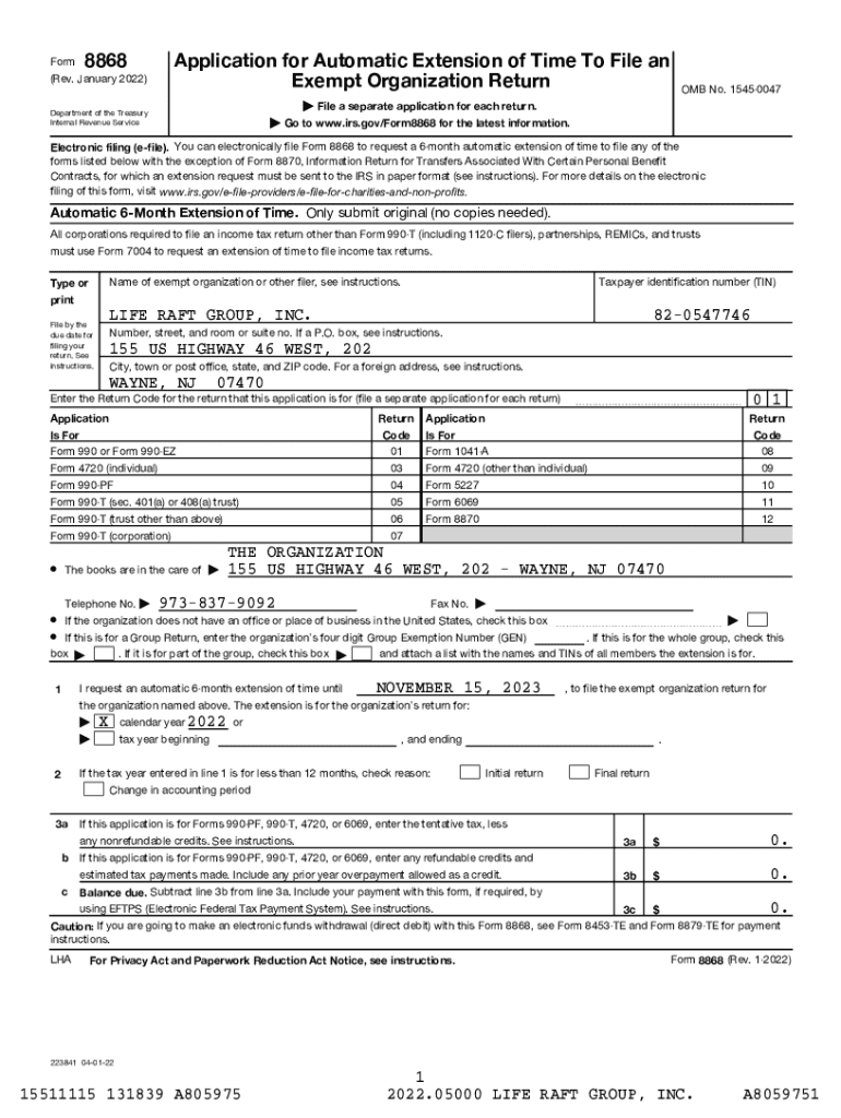 Form8868Application for Automatic Extension of Time To File an Exempt Organization Return(Rev. January 2022)OMB No. 15450047| File a separate application for each return.Department of the Treasury Internal Revenue Service| Go to www.irs.gov/Form8868 for the latest information.Electronic filing (efile). You can electronically file Form 8868 to request a 6month automatic extension of time to file any of the forms listed below with the exception of Form 8870, Information Return for