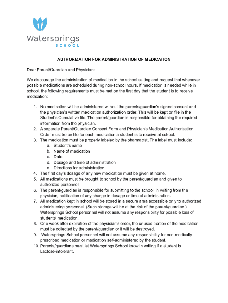 This form secures permission for Watersprings School to administer medication, ensuring safety and compliance with school policies and physician orders.