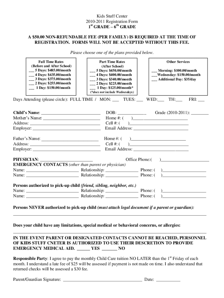 Register your child for Kids Stuff Center\'s 2010-2011 programs with various child care options. Secure your spot with a non-refundable fee today!