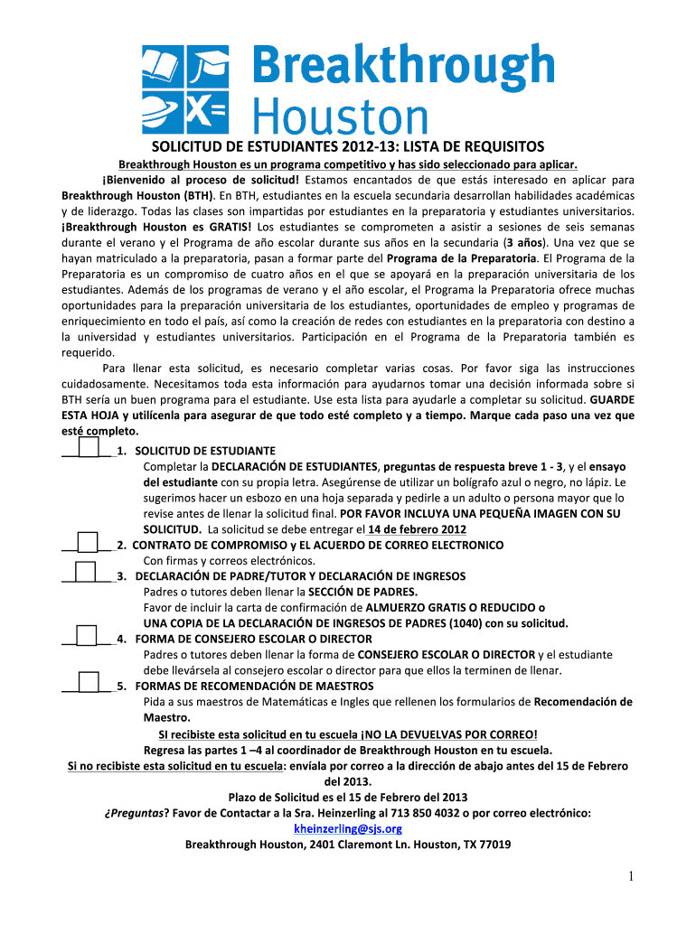 SOLICITED DE ESTUDIANTES 2012- ?13: LIST DE REQUISITES Breakthrough Houston BS UN program competitive y has side seleccionado para apical. Bienvenido all process DE solicited! Estates encantados de