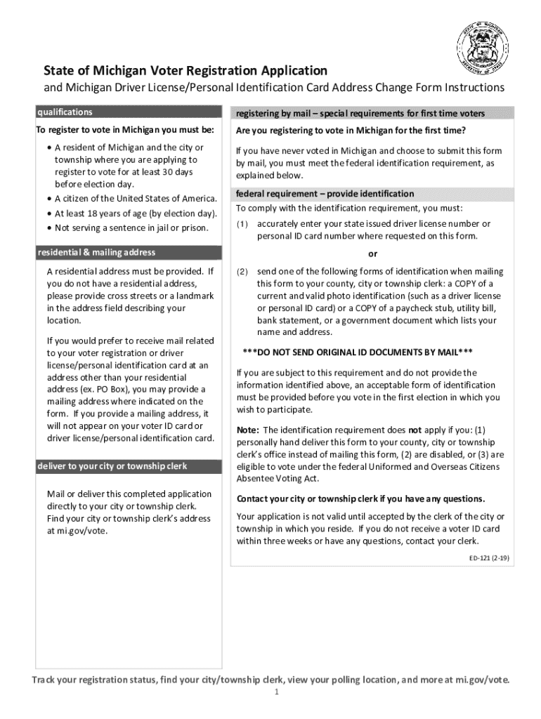 State of Michigan Voter Registration Application and Michigan Driver License/Personal Identification Card Address Change Form Instructions qualifications registering by mail special requirements for