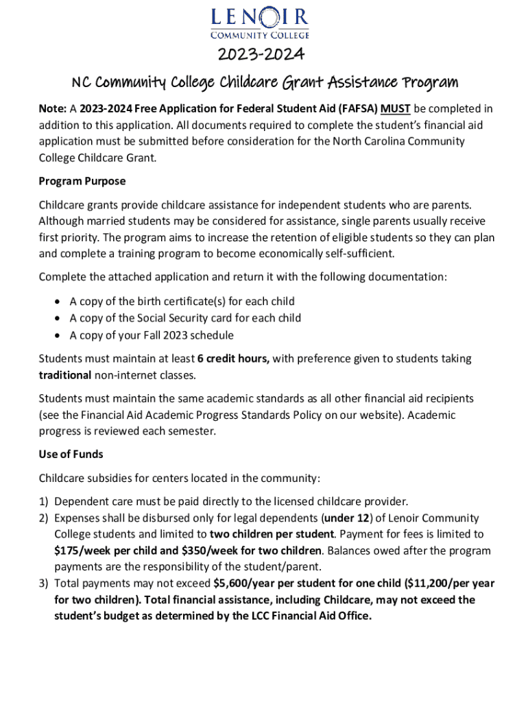 Get the free Nc Community College Childcare Grant Assistance Program