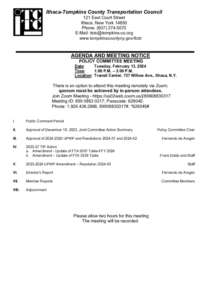 IthacaTompkins County Transportation Council 121 East Court Street Ithaca, New York 14850 Phone: (607) 2745570 EMail: itctc@tompkinsco.org www.tompkinscountyny.gov/itctcAGENDA AND MEETING NOTICE POLICY COMMITTEE MEETINGDate: Tuesday, February 13, 2024 Time: 1:00 P.M. 3:00 P.M. Location: Transit Center, 737 Willow Ave., Ithaca, N.Y.There is an option to attend this meeting remotely via Zoom; quorum must be achieved by inperson attendees. Join Zoom Meeting https://us02web.zoom.us/j/89908830317...
