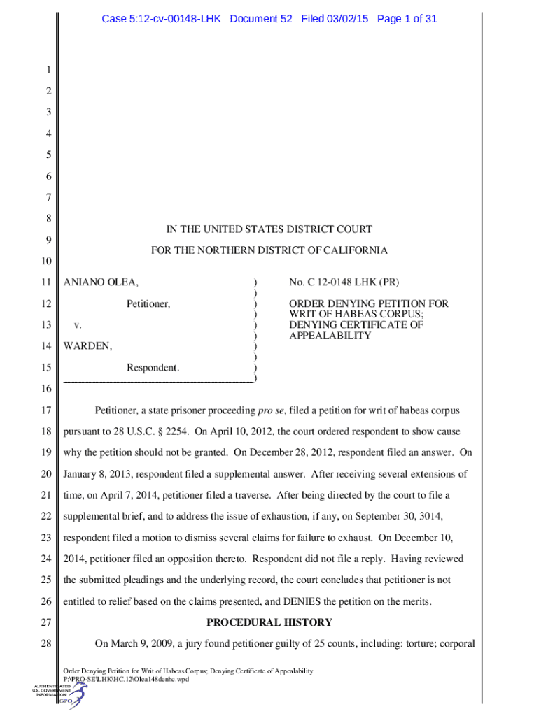 Case 5:12cv00148LHK Document 52 Filed 03/02/15 Page 1 of 311 2 3 4 5 6 7 8 IN THE UNITED STATES DISTRICT COURT 9 FOR THE NORTHERN DISTRICT OF CALIFORNIA 10 11ANIANO OLEA,12 13 14 15Petitioner, v.