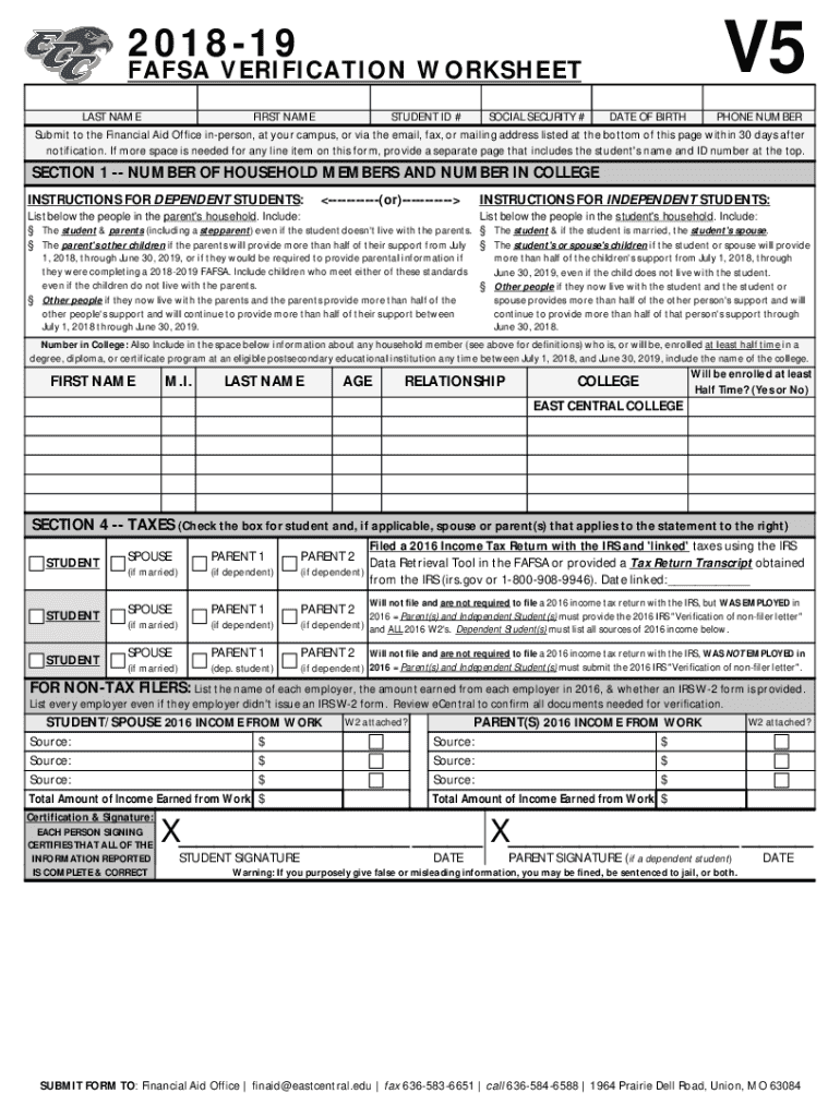 Complete the 2018-19 FAFSA Verification Worksheet to verify your identity and household information for financial aid. Submit it to East Central College.