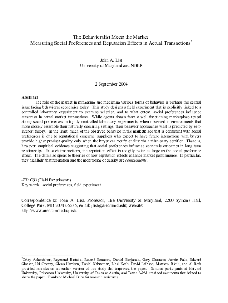 The Behavioralist Meets the Market: Measuring Social Preferences and Reputation Effects in Actual Transactions* John A. List University of Maryland and NBER2 September 2004 Abstract The role of the