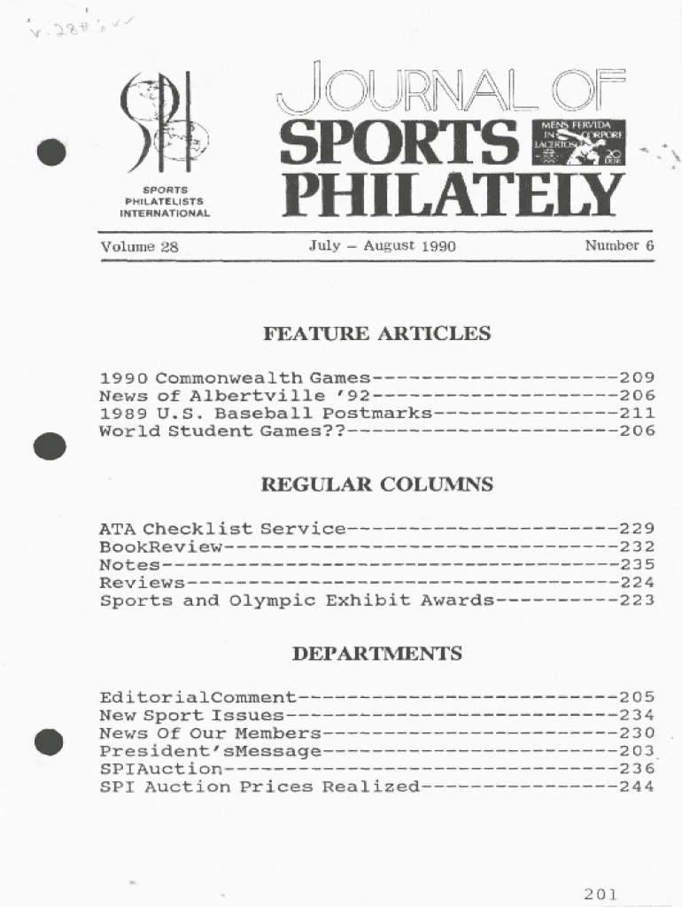 VWk\'\'FERV1DA 1TRTORESPORTS PHILATELISTS INTERNATIONALVolume 28SPORTS PHILATELY July August 1990Number 6FEATURE ARTICLES 1990 Commonwealth Games News of Albertville \'92 1989 U.S. Baseball Postmarks World Student Games??209 206 211 206REGULAR COLUMNS ATA Checklist Service BookReview Notes Reviews Sports and Olympic Exhibit Awards229 232 235 224 223DEPARTMENTS EditorialComment New Sport Issues News Of Our Members President\' sMessage SPIAuction SPI Auction Prices Realized2 05 234 230 2