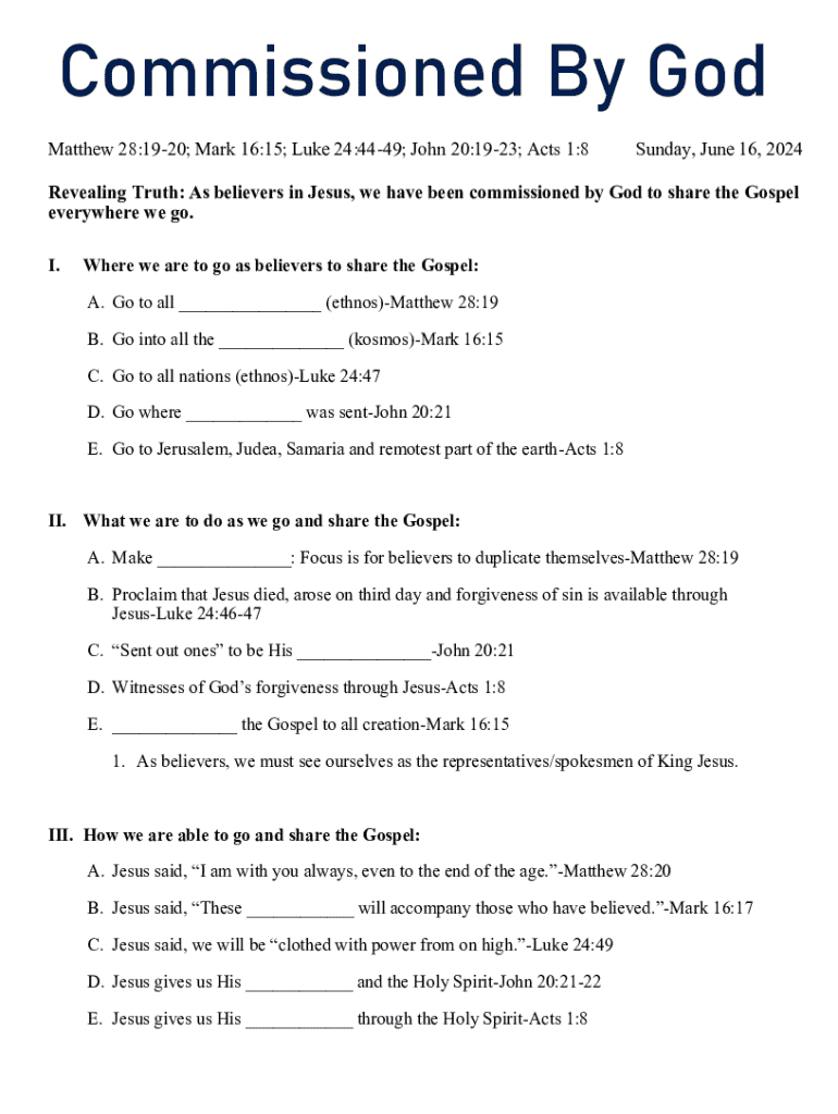 Filling out commissioned by God involves reflecting on one's faith, understanding the specific calling, and taking steps to fulfill that mission, often through prayer, community involvement, or spiritual guidance.
