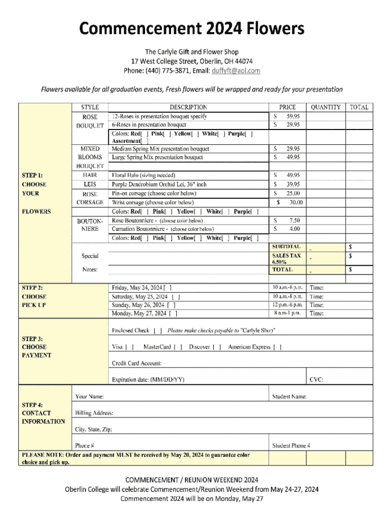 Commencement2024 Flowers The Carlyle Gift and Flower Shop 17 West College Street, Oberlin, OH 44074 Phone: (440 7753871, Email: duffyft@aol.comFlowers available for all graduation events, Fresh flowers