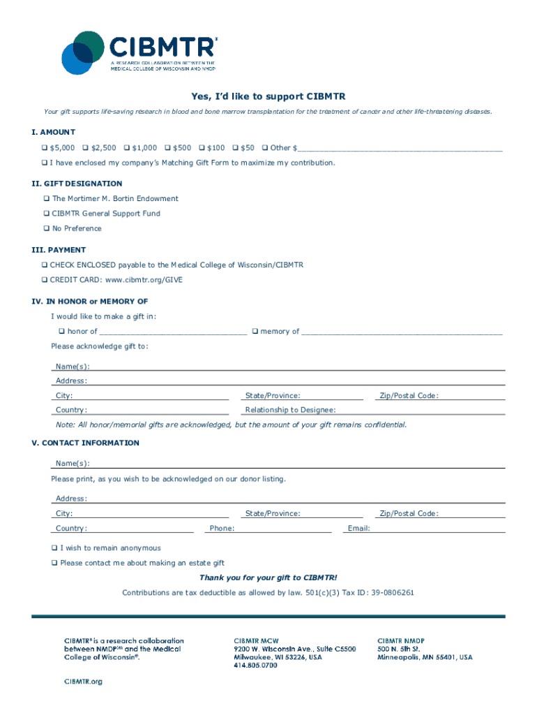 Yes, Id like to support CIBMTR Your gift supports lifesaving research in blood and bone marrow transplantation for the treatment of cancer and other lifethreatening diseases.I. AMOUNT $5,000 $2,500