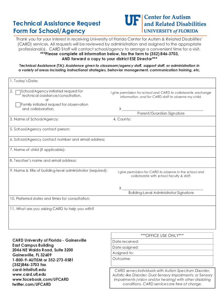 Submit your request for technical assistance from the University of Florida CARD. Connect with professionals for support in education and behavior management.