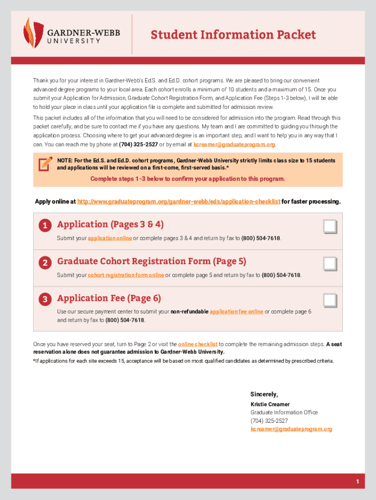 Student Information PacketThank you for your interest in GardnerWebbs Ed.S. and Ed.D. cohort programs. We are pleased to bring our convenient advanced degree programs to your local area. Each cohort