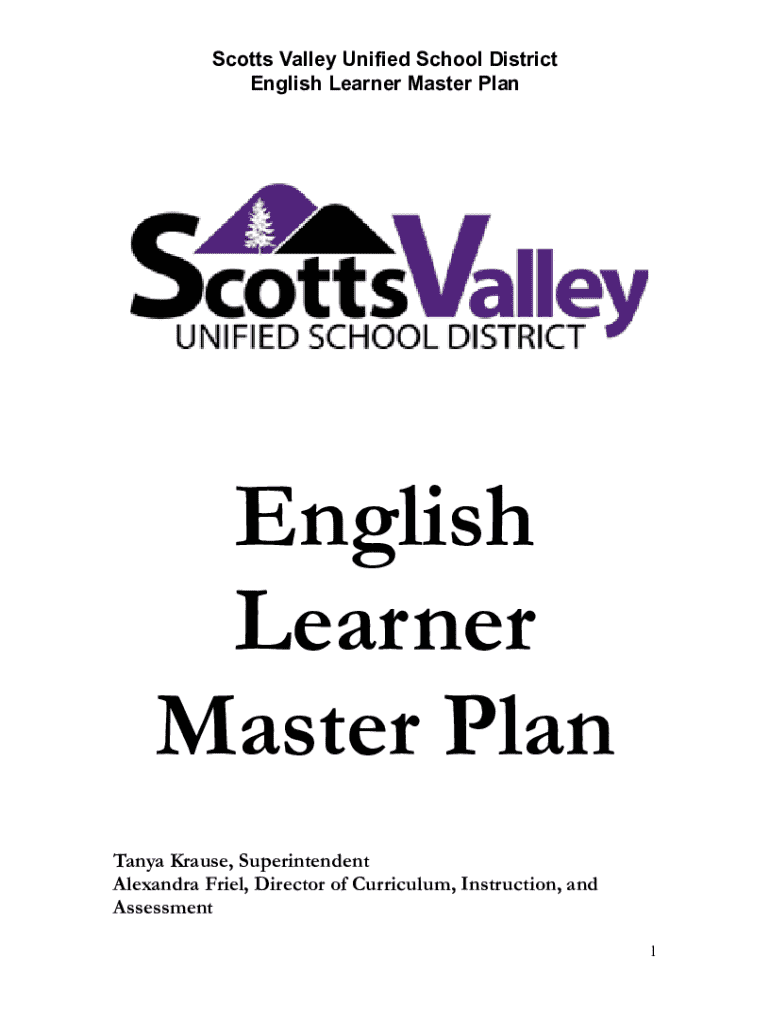 Scotts Valley Unified School District English Learner Master PlanEnglish Learner Master Plan Tanya Krause, Superintendent Alexandra Friel, Director of Curriculum, Instruction, and Assessment 1Scotts Valley Unified School District English Learner Master Plan Table of Contents I. II.Californias Vision and Mission of Success for English Learners Scotts Valley USD Board Policy Education for English Learners (BP 6174) a. Identification and Assessments b. Language Acquisition Programs c. Program...