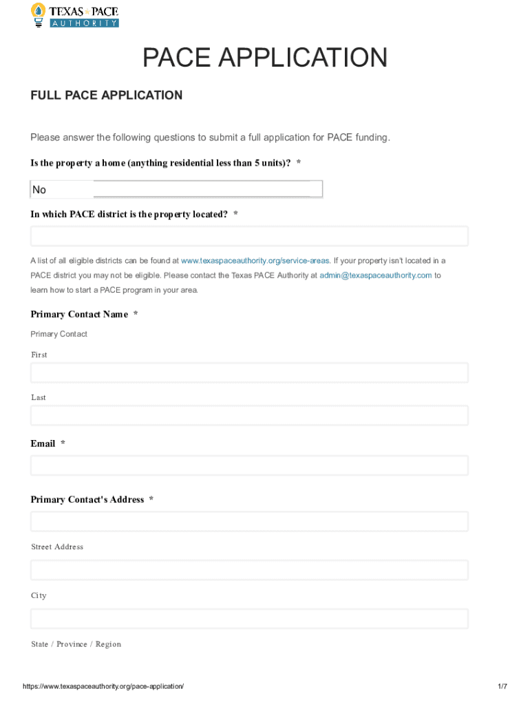 Complete the Full PACE Application for funding eligibility in Texas, ensuring to provide accurate property and contact information.