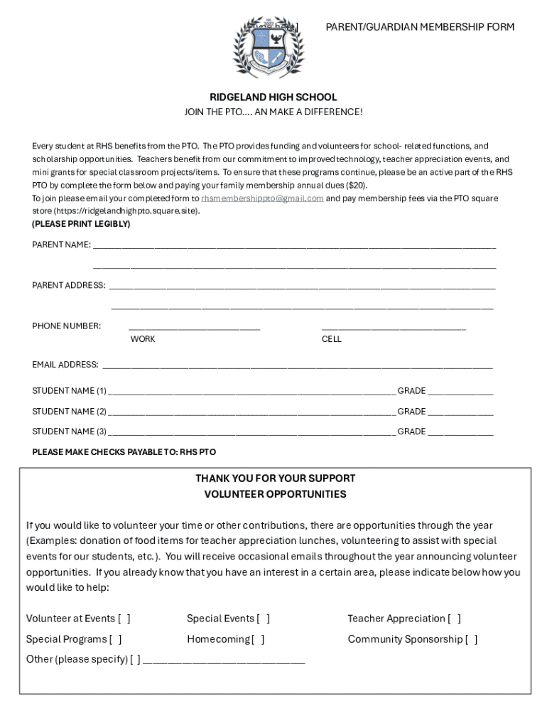[Type here]PARENT/GUARDIAN MEMBERSHIP FORMRIDGELAND HIGH SCHOOL JOIN THE PTO. AN MAKE A DIFFERENCE! Every student at RHS tenets from the PTO. The PTO provides funding and volunteers for school related