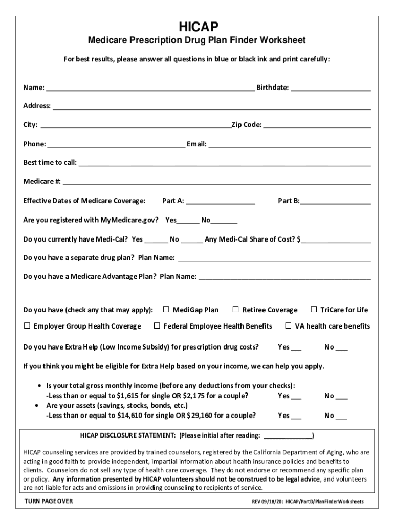 Complete the HCAP Medicare Prescription Drug Plan Finder Worksheet to assess your coverage and eligibility for aid in selecting the best plan for your needs.