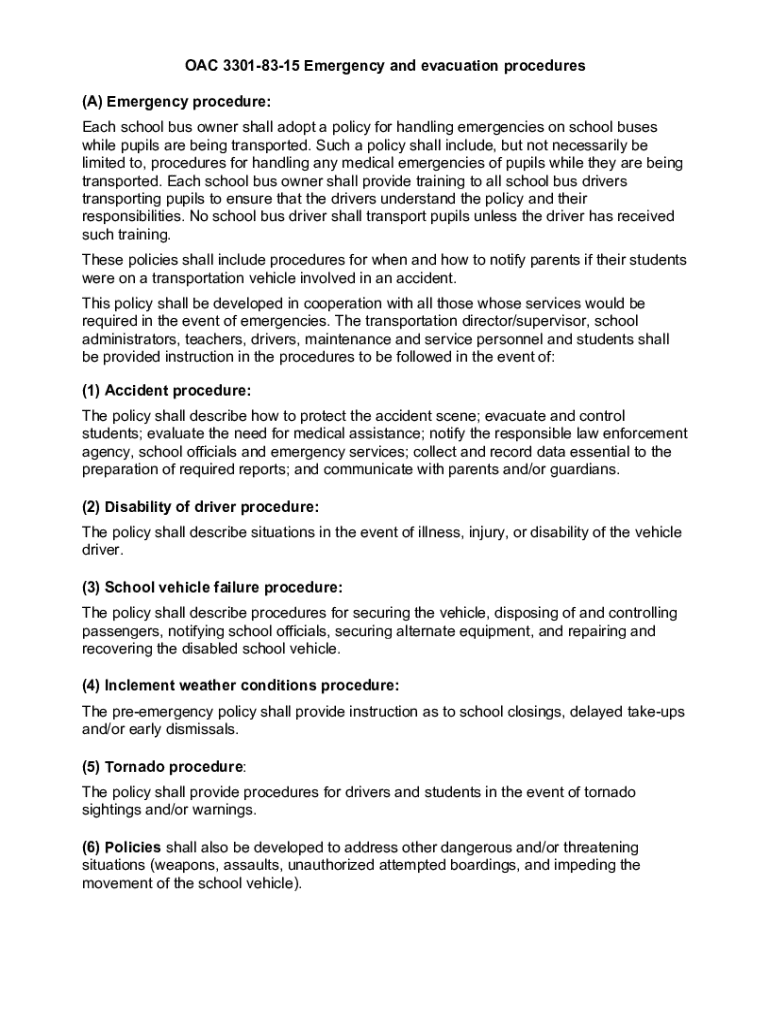 Comprehensive emergency and evacuation procedures for school buses, ensuring safety and preparedness for various emergencies while transporting students.