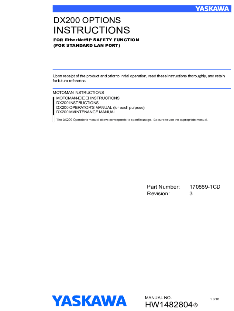 DX200 OPTIONSINSTRUCTIONS FOR EtherNet/IP SAFETY FUNCTION (FOR STANDARD LAN PORT)Upon receipt of the product and prior to initial operation, read these instructions thoroughly, and retain for future reference. MOTOMAN INSTRUCTIONS MOTOMAN INSTRUCTIONS DX200 INSTRUCTIONS DX200 OPERATORS MANUAL (for each purpose) DX200 MAINTENANCE MANUAL The DX200 Operators manual above corresponds to specific usage. Be sure to use the appropriate manual.Part Number: Revision:1705591CD 3MANUAL NO