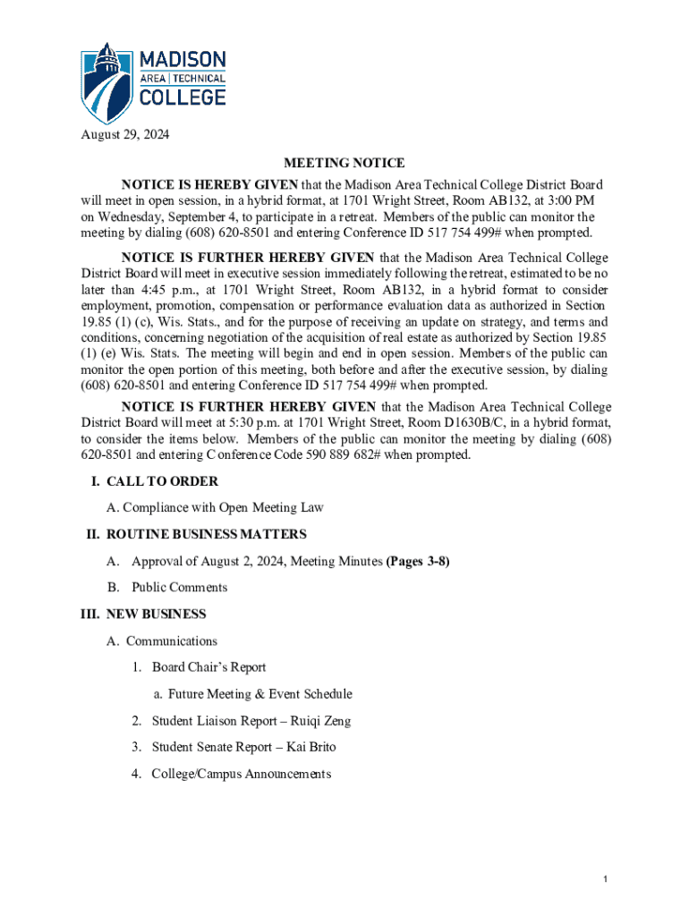 August 29, 2024, MEETING NOTICE IS HEREBY GIVEN that the Madison Area Technical College District Board will meet in open session, in a hybrid format, at 1701 Wright Street, Room AB132, at 3:00 PM