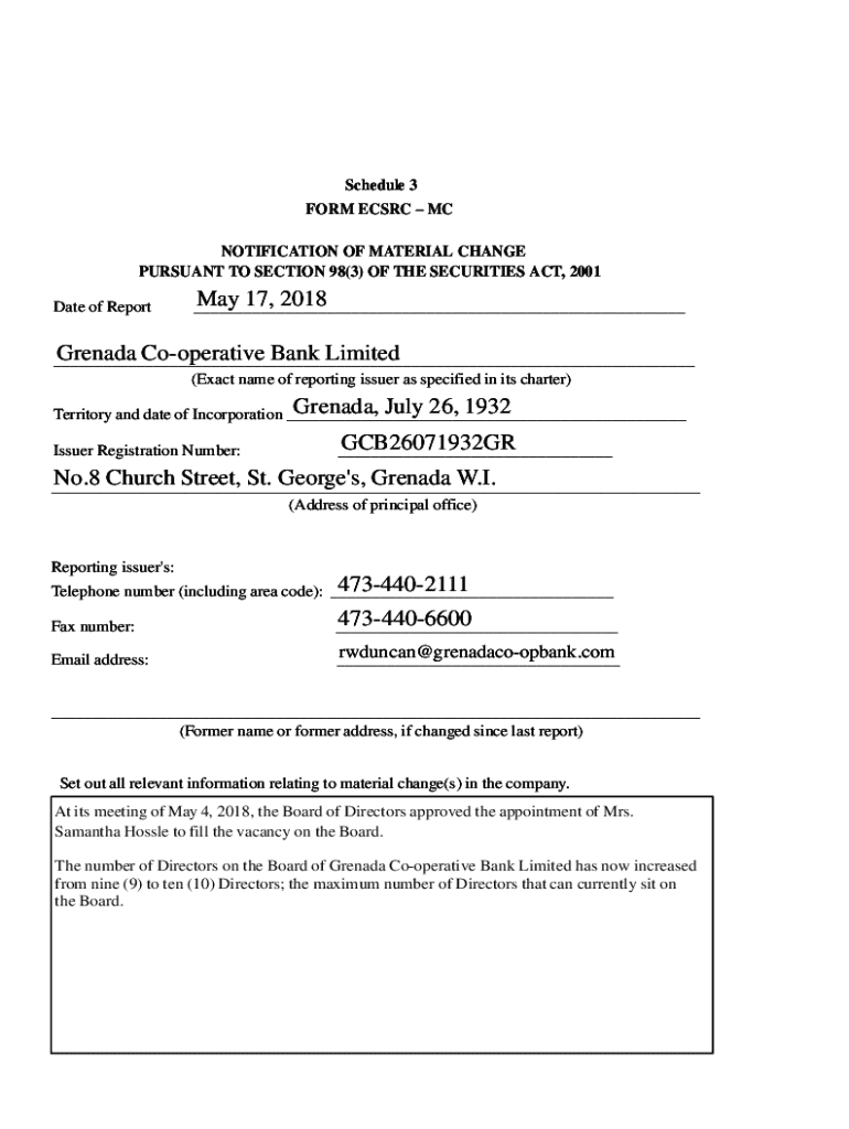 This document reports the appointment of a new director at Grenada Co-operative Bank Limited as of May 17, 2018, per Section 98(3) of the Securities Act.