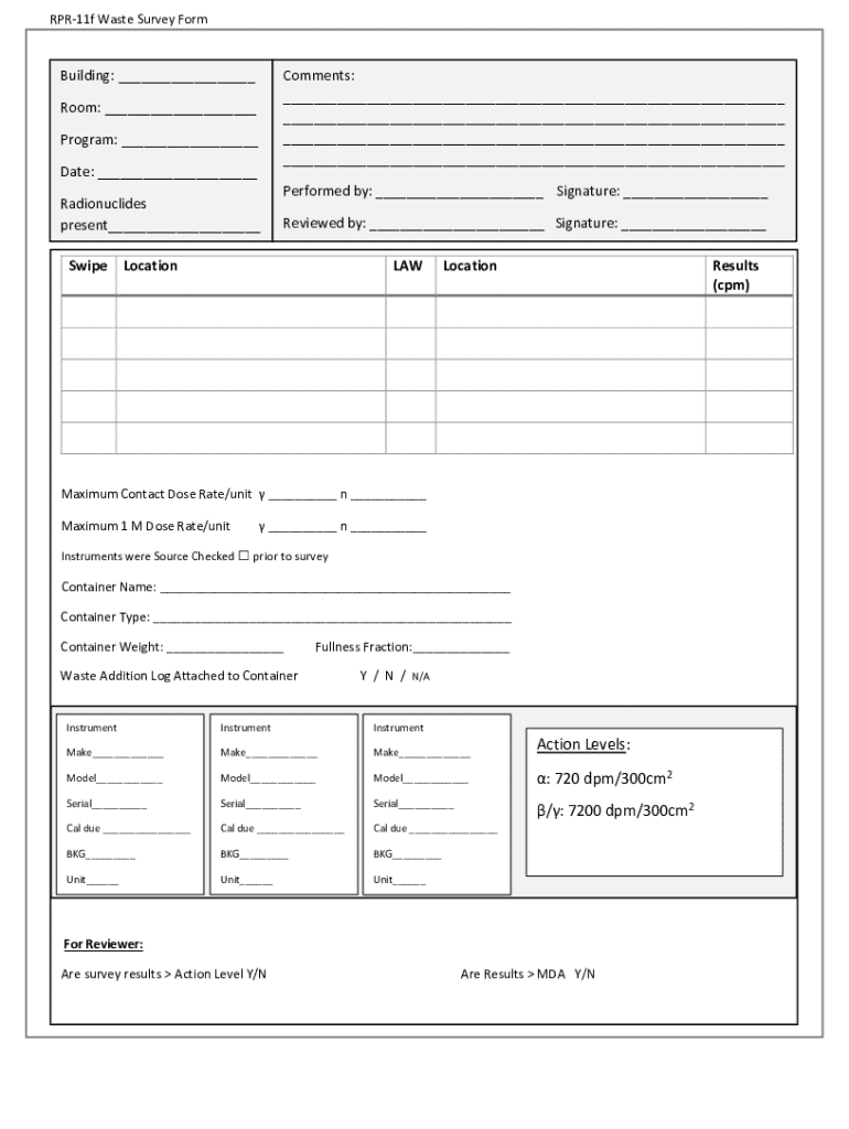 RPR11f Waste Survey Rebuilding: ___Comments: ___ ___ ___ ___Room: ___ Program: ___ Date: ___ Radionuclides present___ SwipePerformed by: ___ Signature: ___ Reviewed by: ___ Signature: ___LocationLAWLocationResults