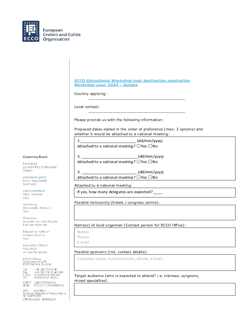 To fill out the ECCO educational workshop host form, provide details such as the workshop title, date, location, and participant information, ensuring accuracy and completeness.