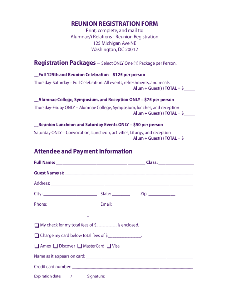Register for the 125th Reunion Celebration at Trinity DC. Choose your package and provide attendee details. Join us for a memorable event!
