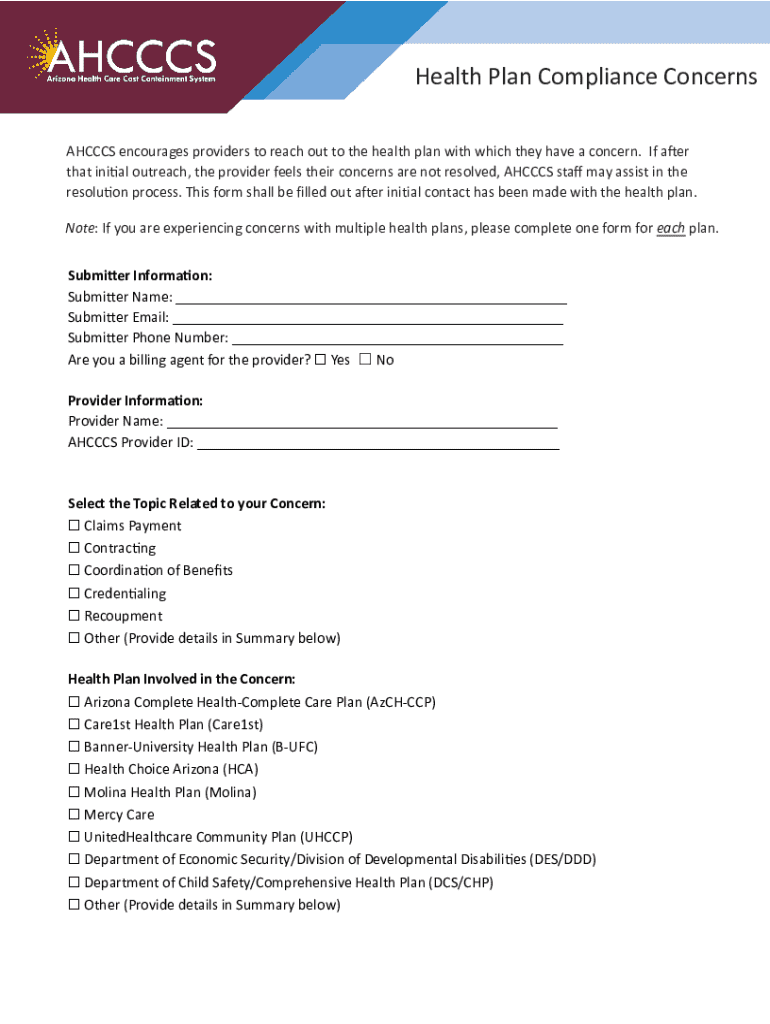 Health Plan Compliance Concerns AHC CCS encourages providers to reach out to the health plan with which they have a concern. If AER that finial outreach, the provider feels their concerns are not