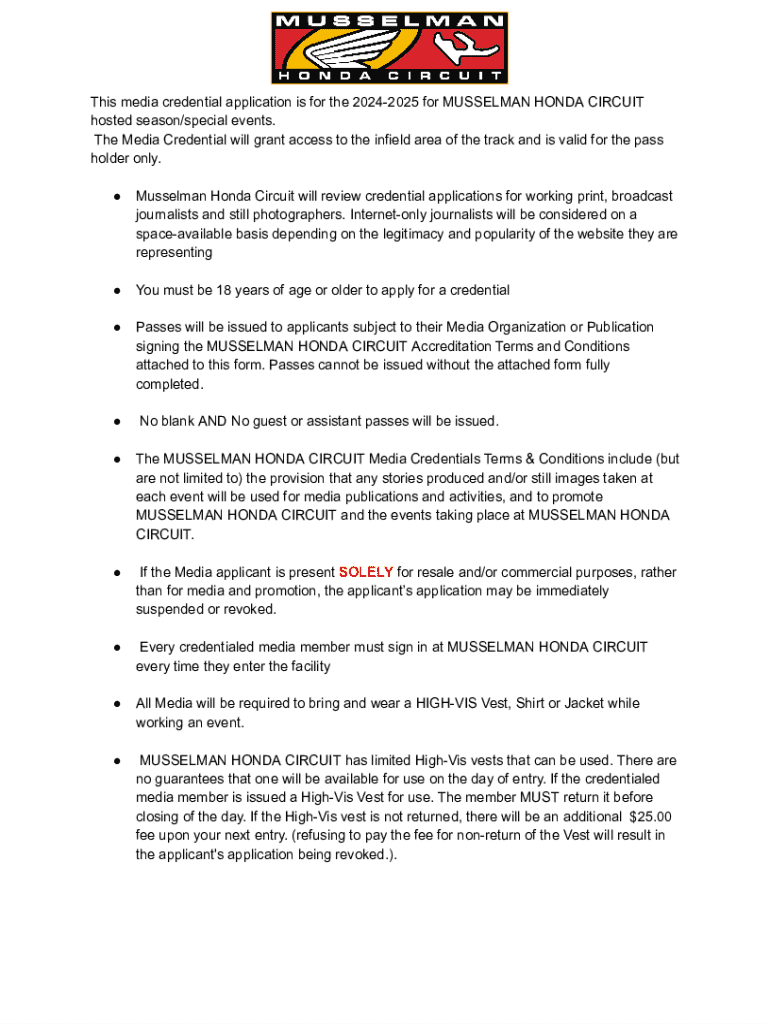 Apply for the 2024-2025 media credentials at Mussel man Honda Circuit. Gain access to exclusive events and meet necessary requirements for media representatives.