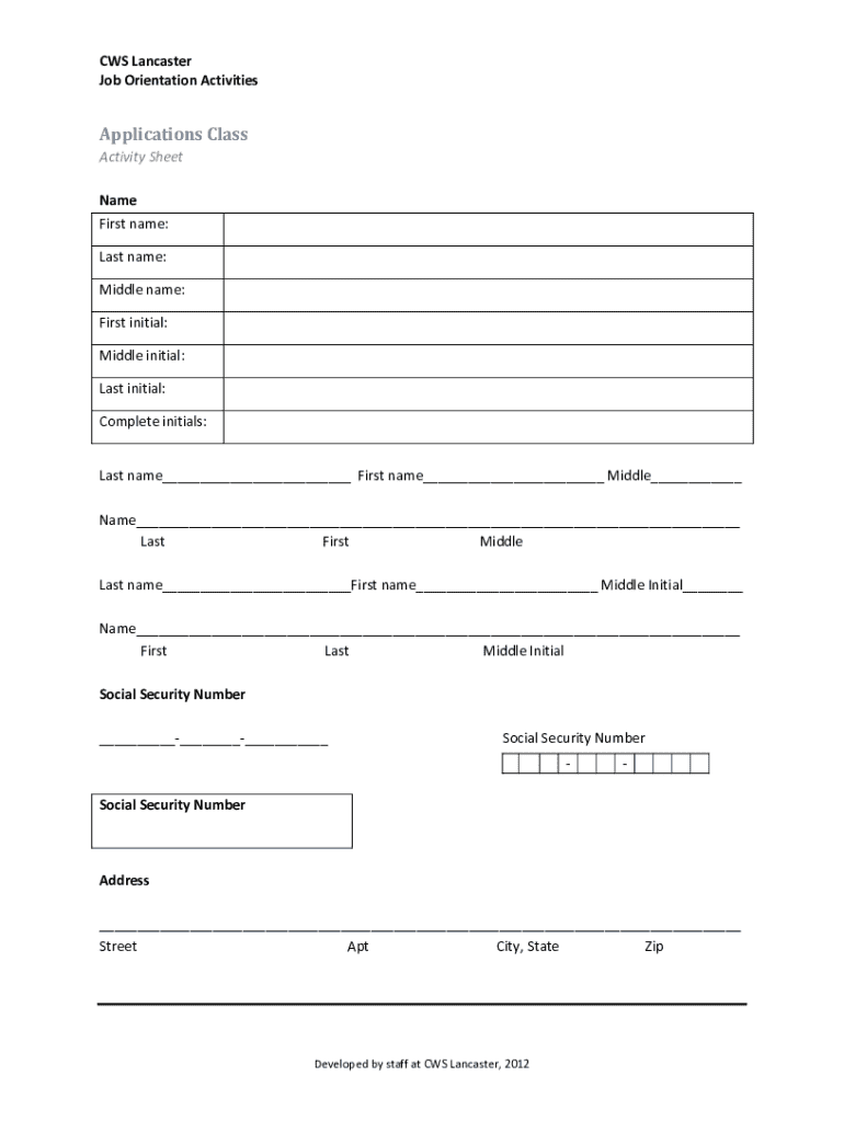 Complete the CWS Lancaster Job Orientation Activities application. Include personal details, SSN, and work authorization information. Essential for employment.
