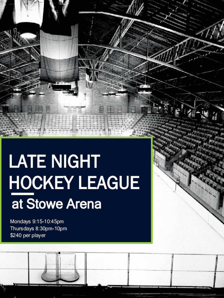 LATE NIGHT HOCKEY LEAGUE at Stowe Arena Mondays 9:1510:45pm Thursdays 8:30pm10pm $240 per player120192020 LATE NIGHT HOCKEY LEAGUE AT STOWE ARENA Wish you could play on a hockey league, but have conflicts