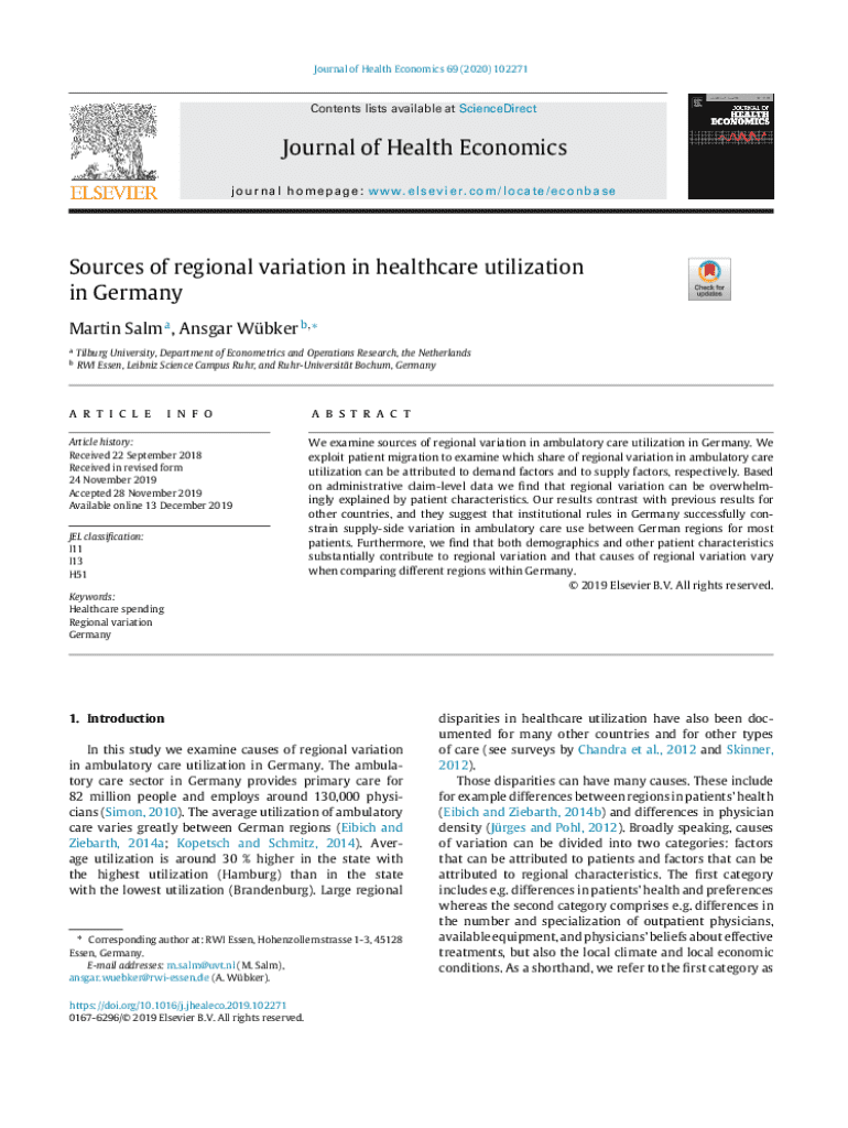 Journal of Health Economics 69 (2020) 102271Contents lists available at ScienceDirectJournal of Health Economics journal homepage: www.elsevier.com/locate/econbaseSources of regional variation in healthcare utilization in Germany Martin Salm a , Ansgar Wbker b, a bTilburg University, Department of Econometrics and Operations Research, the Netherlands RWI Essen, Leibniz Science Campus Ruhr, and RuhrUniversitt Bochum, Germanya r t i c l ei n f oArticle history: Received 22 September