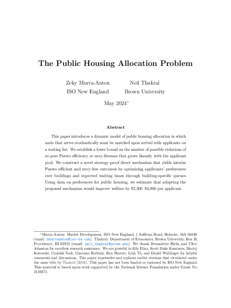 The Public Housing Allocation Problem Zeky MurraAntonNeil ThakralISO New EnglandBrown UniversityMay 2024Abstract This paper introduces a dynamic model of public housing allocation in which units that arrive stochastically must be matched upon arrival with applicants on a waiting list. We establish a lower bound on the number of possible violations of expost Pareto efficiency or envyfreeness that grows linearly with the applicant pool. We construct a novel strategyproof direct mechanism