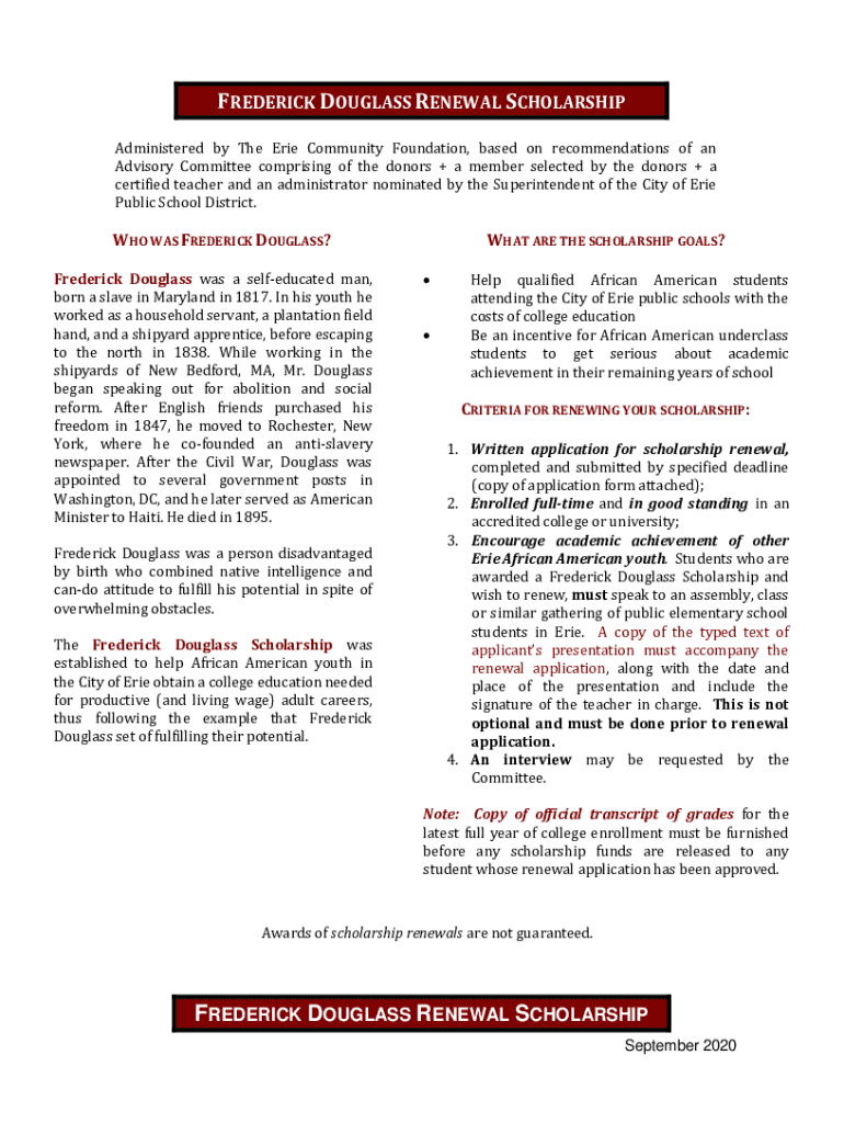 Apply for the Frederick Douglass Renewal Scholarship, aimed at supporting African American students in Erie with college education costs. Renewals require academic engagement and presentations.
