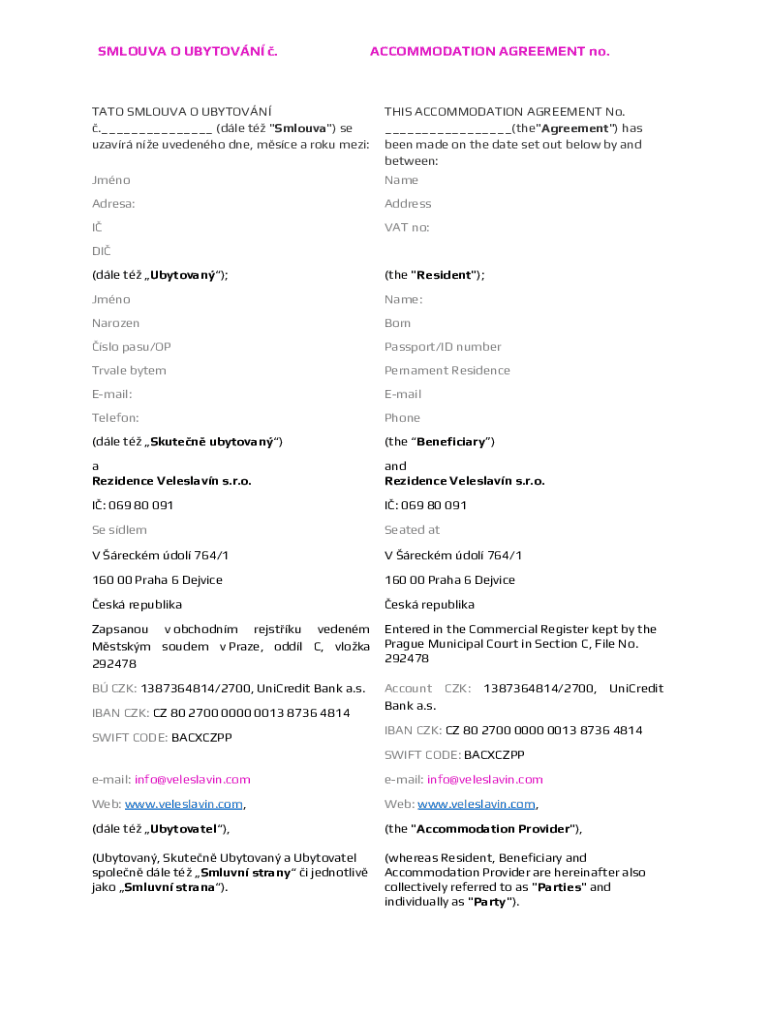 SMLOUVA O UBYTOVN .ACCOMMODATION AGREEMENT no.TATO SMLOUVA O UBYTOVN .___ (dle t \"Smlouva \") se uzavr ne uvedenho dne, msce a roku mezi:THIS ACCOMMODATION AGREEMENT No. ___(the\"Agreement\") has been made on the date set out below by and between:JmnoNameAdresa:AddressIVAT no:DI (dle t Ubytovan);(the \"Resident\");JmnoName:NarozenBornslo pasu/OPPassport/ID numberTrvale bytemPernament