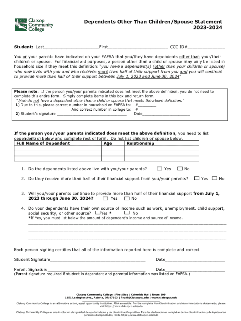 Dependents Other Than Children/Spouse Statement 20232024Student: Last___First___ CCC ID#___ You or your parents have indicated on your FAFSA that you/they have dependents other than your/their children