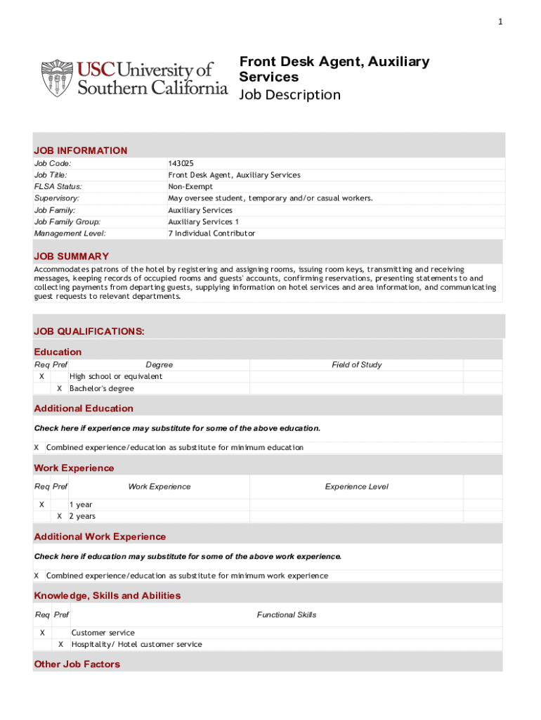 Explore the role of Front Desk Agent in Auxiliary Services at USC, focusing on facilitating guest accommodations and enhancing hotel customer service.