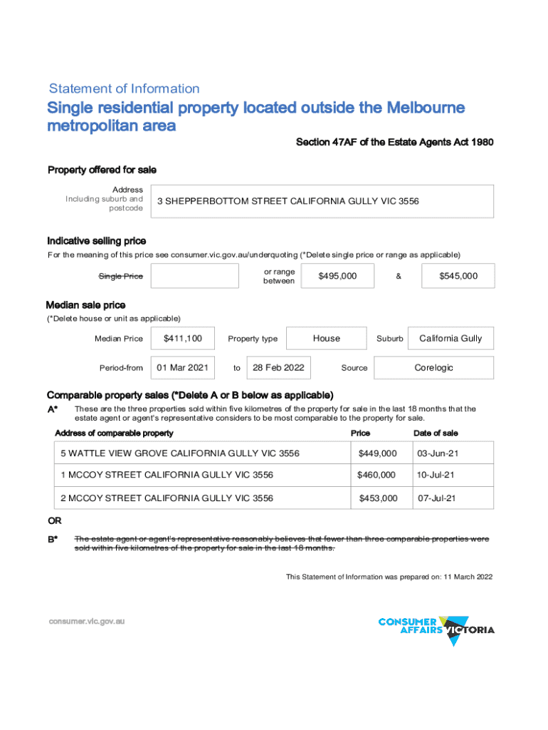 Explore the Statement of Information for a residential property in California Gully, VIC, including sale prices and comparable properties' data.