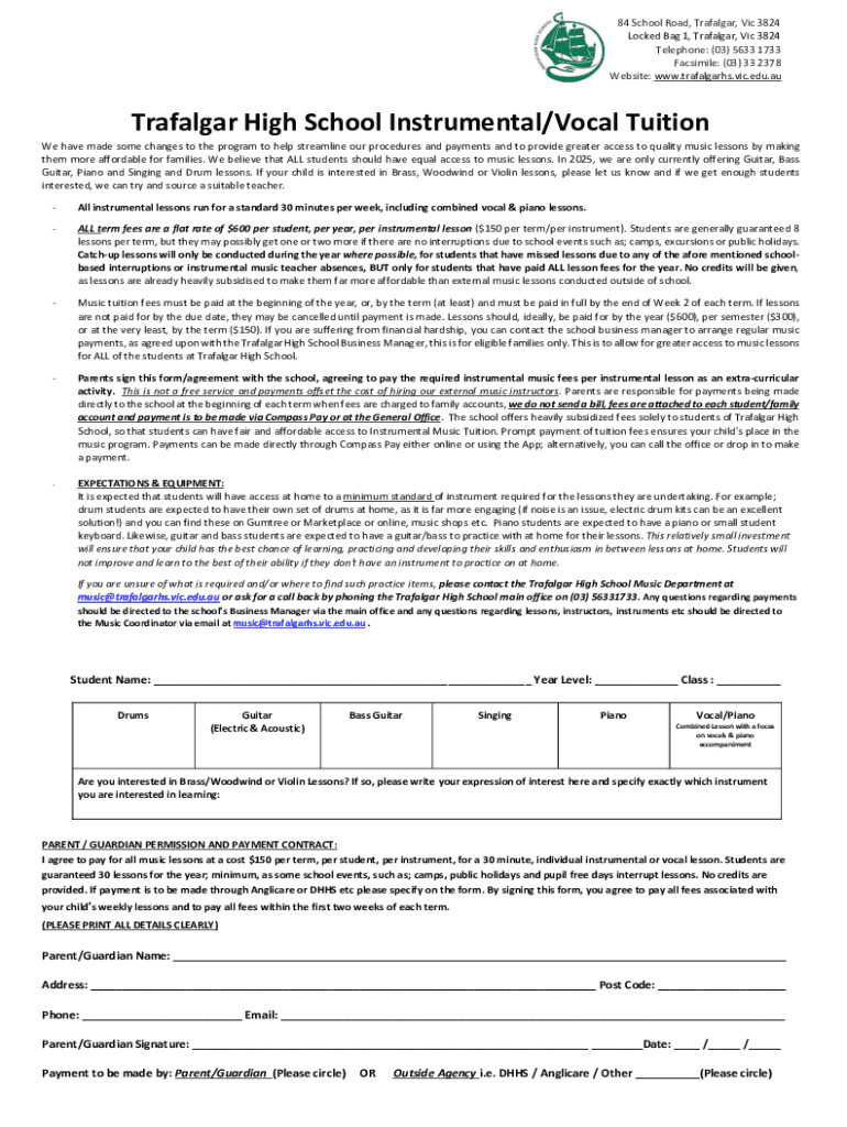 Get the free Trafalgar High School Instrumental/vocal Tuition Agreement