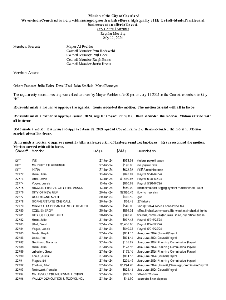 Explore the detailed minutes of the City Council meeting held in July 2024, covering crucial city planning, decisions, and financial reports for Courtland.